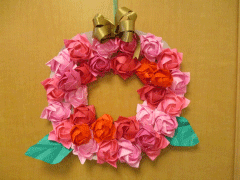 デイケアの入り口に、5月はバラのリースが登場しました。ピンクや赤の微妙に色の違うバラの花がたくさん!入り口がとっても明るく華やかになりました。