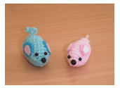 さて、ここまで出来たら、今度は編みぐるみに挑戦!初めは小さいネズミから。ちょっとした編み方や綿の詰め方、そして、目や鼻、耳の位置でひとつひとつ違った表情のネズミが出来上がりました。並べるとさらにかわいい!!