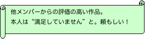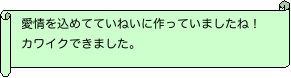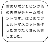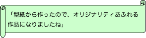 だんだんと寒さも和らぎ、散策プログラムで、先週つぼみだった花が見事に咲いてるのを見たりすると、春なんだなーと感じます。 思えば大地震の後は余震や放射線が怖くて、あんまり季節をかみしめる機会もなかったから余計にそう感じるのかも。 「この先どうなってしまうのか?」不安はつきませんが、非常用の持ち出しバッグを用意したり、避難場所を決めたりとしっかり準備をした上で、気持を切り替えて前向きに楽しく皆さんと過ごせればいいなと思います。 さて今回は、今まで創作活動の時間に作った作品の写真を、製作者のコメントとともに紹介したいと思います。 バックナンバー一覧へ このページのTOPへ