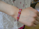 『ビーズの花のミサンガ』です。平結びの中にビーズを通して花を作りました。とてもかわいいミサンガができました。色あいもすてきです。